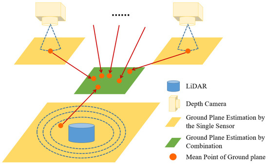 Therefore, based on the ground plane fitting proposed in the literature [13], the ground point cloud is extracted by using a single-sensor multi-plane combination of the plane fitting method, which follows the following principles. Details are described in Figure 3. Firstly, the ground point cloud has distinct planar features, which can be fitted by a planar formula. Secondly, for UGVs, the points with the lowest height values are most likely to belong to the ground point cloud, so there is no need to introduce the RANSAC process. Third, utilizing each individual sensor for plane fitting and then combining the plane information to form a new plane would enable the use of parallel computing to improve algorithmic efficiency. The fused point cloud consists of the LiDAR’s point cloud and several depth cameras’ point clouds from to . A single sensor’s point cloud or needs to be sorted in ascending order according to the height value. Taking as an example, its ascending state is represented as . A set of seed points with low height values are selected to estimate the initial plane formulation for the ground, described as .