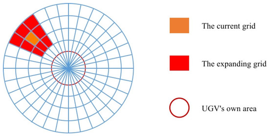 Because the grid division is delicate, it is unscientific to judge whether there is an obstacle in the grid only by the number of points falling into the grid. Including neighboring grids in the statistics will reflect the true condition of the current grid. Specifically, with the current grid as the center, expand steps forward and backward on the polar diameter and steps forward and backward on the polar angle. The number of points falling into the expanding grids is defined as . The schematic diagram of the above process is shown in Figure 4. For the convenience of explanation, the parameters and are both set to 1.