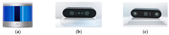 The loaded sensors. (a) Leishen C32W LiDAR; (b) Orbbec DaBai DCW2; (c) Orbbec Dabai MAX.