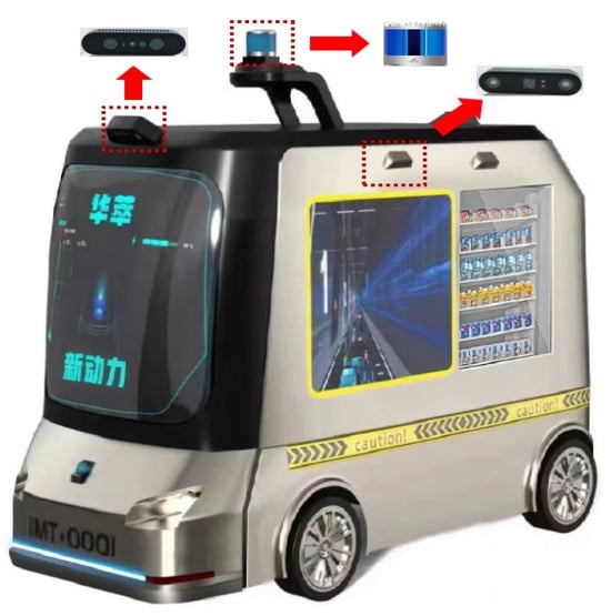 In order to verify the effectiveness of the proposed method, the authors selected the cleaning UGV to test the effectiveness and real-time capability of the proposed algorithm. This UGV is equipped with one Leishen C32W LiDAR in its top center and four depth cameras in front, behind, left, and right of it. Specifically, the camera model installed in the front and behind directions is the Orbbec DaBai DCW2, which has a detection range of 0.2 m to 3 m and provides a depth resolution of 640 × 400. Conversely, the camera model installed in the left and right directions is the Orbbec Dabai MAX (Orbbec, Shenzhen, China), which has a detection range of 0.2 m to 2.5 m and provides a depth resolution of 640 × 320. The frequency of all the sensors is set to 10 hz for maintaining time consistency. The loaded sensors are shown in Figure 5 and the cleaning UGV is shown in Figure 6.