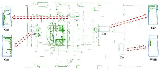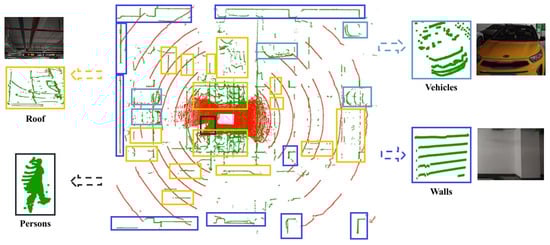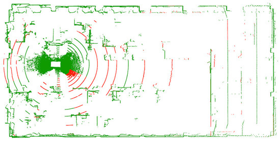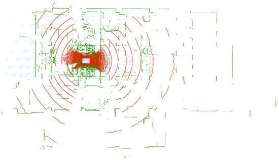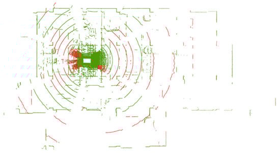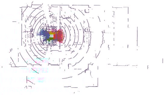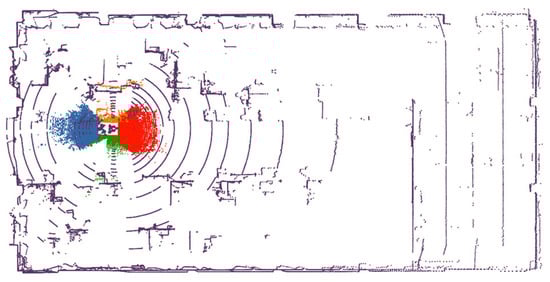 The UGV is equipped with an Intel Core i7 (Santa Clara, CA, USA) processor with 3.1GHz and 16G RAM, which has enough computing ability in point cloud calculation. The transmission of sensor data is achieved through the Robot Operating System (ROS) (Stanford, CA, USA) framework [35]. This UGV will be tested in two environments; one is a warehouse and the other is a parking scene. The total acquisition time of the warehouse scene is 431 s. Its main static obstacles include boxes and walls in various scenes. During the acquisition process, people walking in the warehouse are its main dynamic obstacles. The noise mainly comes from the unstable point cloud information obtained by the depth camera. The acquisition time of the parking scene is 1204 s. Its main static obstacles include pillars, walls, and stationary vehicles. Since drivers get out of cars and vehicles start moving during the acquisition process, its main dynamic obstacles include pedestrians and moving vehicles. Similarly, its noise source is mainly the unstable observation value of the depth camera. After the process of multi-sensor point cloud fusion, the vertical view of the fused point cloud in the main coordinate system is shown in Figure 7 and Figure 8. The red, orange, blue, green, and purple point clouds come from the front-view depth camera, left-view depth camera, behind-view depth camera, right-view depth camera, and LiDAR sensor, respectively. The UGV is located in the middle of the wrapped area of four depth camera point clouds. It can be clearly observed that the detection distance of the depth camera is smaller but the point cloud is dense, while the detection distance of the LiDAR sensor is longer but the point cloud is relatively sparse.