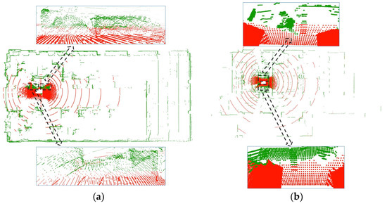 Detailed image of the ground segmentation effect of the proposed algorithm. (a) Warehouse; (b) parking.