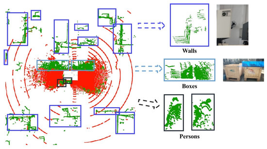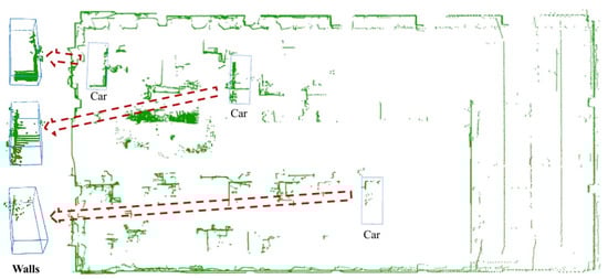 However, although the proposed algorithm has a better performance in ground segmentation, there are still some shortcomings in the proposed algorithm, as shown in Figure 15. Since there is a height threshold based on plane fitting, this will cause the points where obstacles are close to the ground plane to be incorrectly classified into the ground point cloud. This problem is more obvious in scenes with many small objects. Meanwhile, some remote points generated by depth cameras are mistakenly identified as obstacle points.
