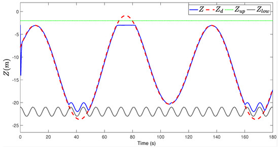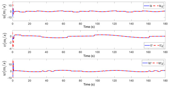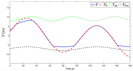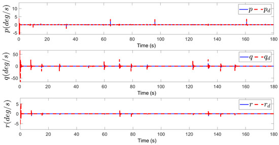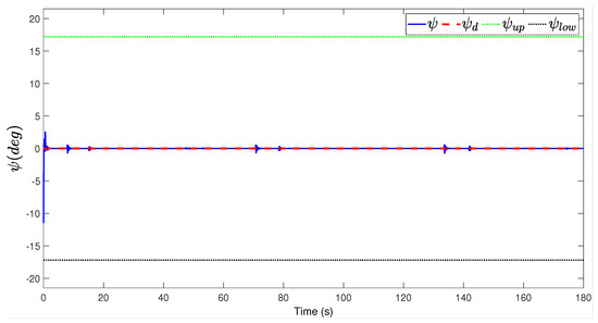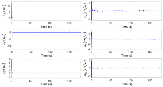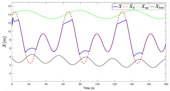 Figure 3, Figure 4, Figure 5, Figure 6, Figure 7, Figure 8, Figure 9 and Figure 10 are the state tracking responses of the UAH under the system uncertainties and multisource disturbances, Figure 3, Figure 4, Figure 5, Figure 6, Figure 7, Figure 8, Figure 9 and Figure 10 correspond to the position, velocity, angle and angular velocity tracking curves of the UAH, respectively. It can be observed from Figure 3 and Figure 7, Figure 8 and Figure 9 that the position P and attitude of the UAH system are restricted within the time-varying security boundaries, and because of the time-varying margins, P and always maintain a certain range with the security boundaries, which further improves the security of UAH. In addition, the velocity and angular velocity of the UAH system can track the desired signals accurately and quickly, which also meets the requirements of the actual system for fast, accurate and stable.