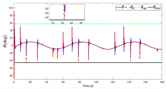 where with x and are the state and desired signal, k is the constraint of z. This method of constraint converts the original state constraint into new bounds of the tracking error. This approach has a disadvantage; that is, when the difference between the error and the constraint condition is small, a larger control force is needed to adjust the performance of system. The biggest difference between the SPA and BLF constraints used in this article is that SPA can evaluate the expected signal in advance and then compare it with the original expected signal to generate a new expected safety signal, and use the constrained desired safety trajectory to design the controller. Therefore, there is no need to constrain the state error, and the input cannot be too large beyond the safe range of the system. In addition, the time-varying safety margin ε is considered in this paper, which further improves the safety performance of the system.