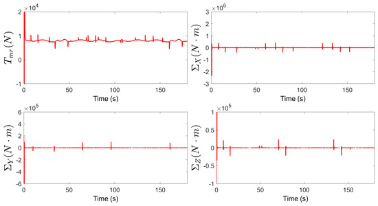 Figure 11 stands for the inputs of the system, where, , , and represent the main rotor pull, yaw moment, pitching moment and rolling moment of UAH, respectively. They work together to realize various maneuvers of the UAH in three-dimensional space. In addition, it can be observed that although there are large vibrations in the s, they can quickly reach stability, and meet the output range of the actual system.