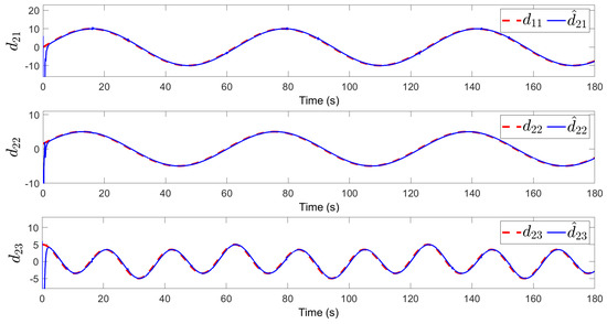 Figure 14 and Figure 15 are the tracking responses of the and . Due to the influence of random disturbance, although there are pulses in the observation process of HODO, the designed observer can still observe the external disturbances quickly and accurately. In addition, compared with the traditional NDO, the HODO obtains the unbiased estimate of the time derivatives of external disturbances, which further improves the observation accuracy of the observer. In order to show the change in the flight trajectory of the unmanned helicopter more clearly, Figure 16 provides a three-dimensional diagram.
