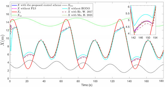 In addition, in order to show the performance and effect of the designed controller, we provide a comparative experiment, as shown in Figure 17, taking X as an example, which contains the tracking curve obtained by different control methods. It can be observed that although X of the proposed control scheme without FLS can track the desired signal, the oscillation is more severe. X of the control scheme without SPA will cause the UAH system to cross the safety boundaries, which may cause the UAH to collide with the obstacle boundaries during operation or coincide with the airframe crash. Though X of the proposed method in [25] can make the output tracking the desired signal, there is slightly larger error. Although the method proposed by [43] can quickly track the desired signal, FTDO has no way to determine an unbiased estimate of the disturbance, resulting in a slightly larger error. The X of the control scheme without HODO can hardly accurately track the time-varying safety expectation signal. In order to make the comparison more clear, we provide Table 3, including the maximum X-axis error and convergence time information under different methods, which clearly shows the superiority of the control strategy proposed in this paper.