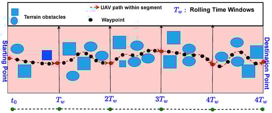 - Step 1: At sampling time , initialize the UAVs and environment information and construct the rolling time window . The environment information involves the size of segment for which paths and obstacles are to be planned.