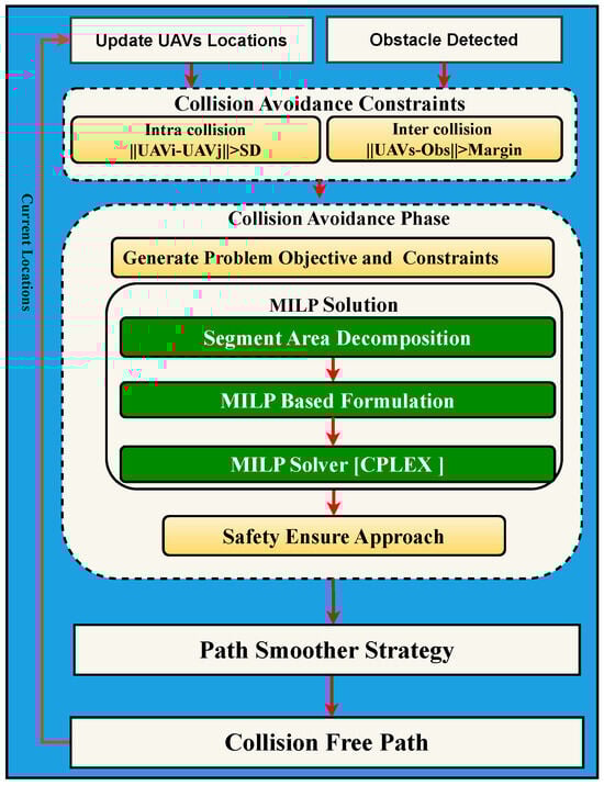 To avoid obstacles, we consider a safety margin around the obstacle, as in [45,46]. The obstacle constraints can be represented by penalizing the path by a high value if it passes through obstacles. This module is responsible for formulating the constraints related to collisions with obstacles as well as with other members of the UAV fleet. The module is integrated into the MILP formulation while enforcing constraints to guarantee safe navigation. A safety margin around each obstacle ensures that the UAVs maintain minimum safe distance from obstacles while navigating. This module penalizes any path that collides with obstacles, effectively steering the UAVs away from obstacles. The constraint for obstacle avoidance is mathematically expressed by the problem constraints in Equation (1)e.