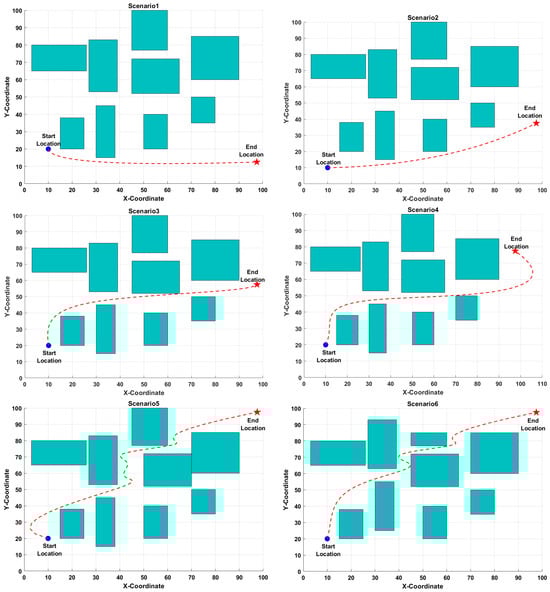 We considered both 2D and 3D scenarios. The 2D scenario focused on static obstacles with different 2D views of the UAV paths. The UAVs flew from the starting position to the destination following the generated energy-efficient and collision-free path. The results are illustrated in Figure 4. The figure shows narrow passages, especially in scenarios 3, 4, 5, and 6. The aim of these scenarios was to test the ability of the UAVs to navigate through such narrow passages using our proposed approach. It can be easily observed that our approach successfully generates collision-free paths in all scenarios.