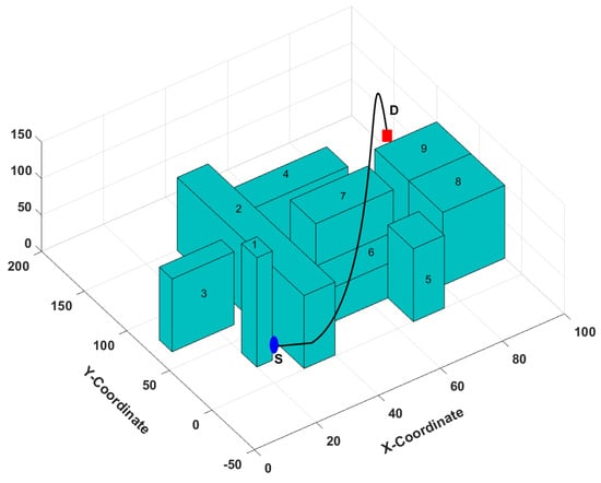- Maximum elevation: The UAVs flew at an altitude of 50 m, and the maximum altitude was restricted 120 m, which was the maximum height of the obstacles.