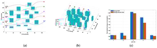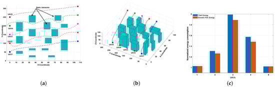 Two- and three-dimensional views of UAV path planning and normalized energy consumption for scenario 1: (a) two-dimensional view, (b) three-dimensional view, and (c) normalized energy consumption.