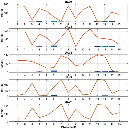 To further test the proposed approach, we considered a highly dense environment with both static and dynamic obstacles, including fifteen static obstacles and fifteen dynamic obstacles. The dynamic obstacles moved at random directions and with random speeds. To show the effectiveness of the proposed approach in avoiding dynamic obstacles, we recorded the minimum distance between the UAVs and the obstacles. The results are exhibited in Figure 8, where the X-axes represent the margins around the obstacles and the Y-axes represent the minimum distance from UAVs to dynamic obstacles. It can be observed that the minimum distance is always greater than the margin, proving that no collisions occurred with dynamic obstacles.