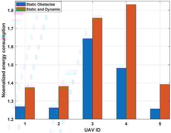 Obstacles can obstruct the flight path of the UAV. To navigate around these obstacles, UAVs may need to change their flight trajectory, which often requires increased power consumption as the system must works harder to maneuver, leading to higher energy consumption. In this subsection, we study the effect of obstacles on energy consumption. We considered a static environment with fifteen static obstacles as well as a dynamic environment with fifteen static obstacles and fifteen dynamic obstacles. For each scenario, we recorded the average normalized energy for 30 runs. Figure 9 depicts the results for the static and dynamic environments. As Figure 9 illustrates, less energy is consumed in the static environment than in the dynamic one. This is because the UAVs rarely fly in the z-direction in a static environment. In the dynamic environment, more energy is required to avoid moving obstacles that can suddenly appear in front of the UAVs and force them to make decisions such as flying vertically to avoid collisions. As a result, there is an increase in overall energy consumption.