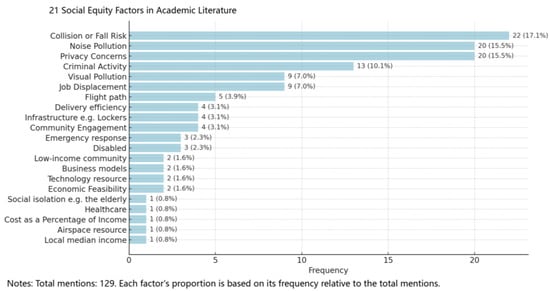 - Collision or Crash Risk (17.1%): The literature frequently highlights the potential for collisions, especially in densely populated urban areas [54], emphasizing the fair distribution of accident risks;