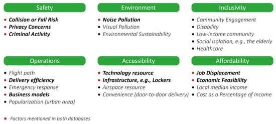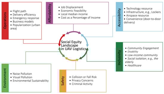 | Social Equity Factors/Considerations | Local Median income | Cost as a Percentage of Income | Economic Feasibility | Visual Pollution | Noise Pollution | Privacy Concerns | Collision or Fall Risk | Criminal Activity | Infrastructure e.g., Lockers | Airspace Resource | Technology Resource | Healthcare, | Social Isolation e.g., the Elderly | Disability | Low-income Community | Job Displacement | Community Engagement | Flight Path | Business Models | Delivery Efficiency | Emergency Response |