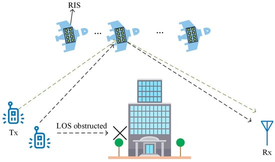 The wireless localization system presented here incorporates a uniformly moving UAV equipped with a RIS, multiple target signal sources (Tx), and a receiving sensor (Rx), as illustrated in Figure 1. In this scenario, the direct LOS path between Tx and Rx is obstructed, posing a challenge to traditional localization methods. However, the incorporation of the RISs on the UAV provides an alternative reflection path for the signal, effectively redirecting it to the Rx and overcoming this obstacle. The primary objective of this research is to determine the transmitters’ locations by analyzing the signals received by the Rx.