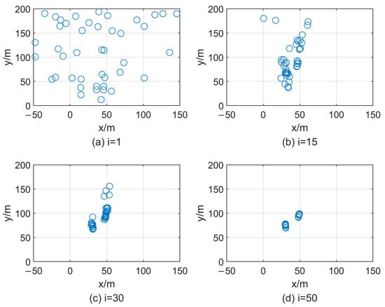 Convergence of particles when the number of iterations is (a) 1, (b) 15, (c) 30, and (d) 50.