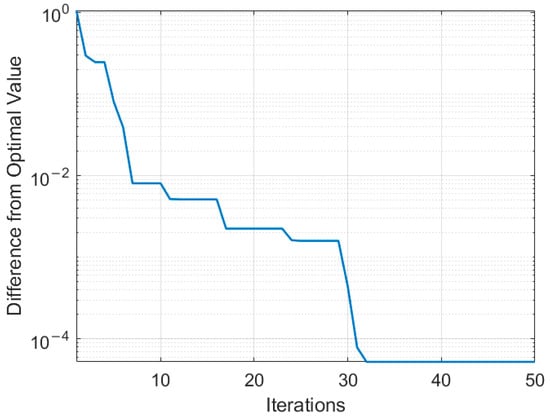 Figure 4 complements this narrative by graphically representing the diminishing gap between the best-found solution at each iteration and the ultimate optimal solution. As the iterations progress, the figure clearly demonstrates the reduction in the difference, illustrating the algorithm’s convergence speed and accuracy. The simulations convincingly showcase the algorithm’s adeptness at minimizing the discrepancy in the objective function to a negligible level, achieving this within 50 iterations.