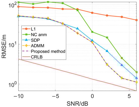 In Figure 5, we present a comparative analysis of the root mean square error (RMSE) of various localization algorithms, including our proposed method, against the CRLB across a range of SNR scenarios from −10 dB to 6 dB. The RMSE is computed using the standard formula: