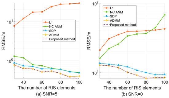 Localization performance versus numbers of RIS elements with different SNR conditions. (a) SNR = 5; (b) SNR = 0.
