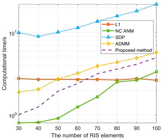 The simulation results depicted in Figure 7 showcase the computational time of different localization algorithms in relation to the increasing number of RIS elements. It is observed that as the number of RIS elements increases, the runtime for all algorithms tends to rise. Among them, the NC-ANM algorithm, despite offering the lowest runtime, falls short in terms of accuracy and robustness. The SDP algorithm, though achieving higher precision, is characterized by higher computational complexity, which results in increased execution times. In contrast, our proposed algorithm offers nearly comparable accuracy with a significantly reduced runtime.