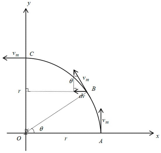 In contrast to non-stationary random time-varying clutter, the echo state of a target is primarily influenced by its motion state. For an aerial target, let us denote the maximum velocity as , and the maximum turning radius as r, the distance corresponding to a range cell in the RD map is , and the Doppler speed corresponding to a Doppler cell is . When the Doppler velocity of the target experiences the most significant change, the target executes a turning maneuver at its maximum speed, as shown in Figure 1.