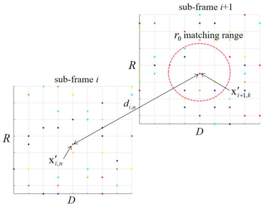 For each peak information vector in the peak information matrix of the sub-frame RDi, it can be observed from the range–Doppler information obtained on the RD map that the majority of the peaks in the peak information matrix of the adjacent sub-frame RDi+1 do not correspond to . To reduce computational complexity and enhance algorithmic efficiency, an initial pairing can be conducted based on the range–Doppler information. For this purpose, the Euclidean distance is used, range–Doppler () position of any peak in the sub-frame RDi, a circular region centered on () with as the radius is defined as the matching range. The peaks in the adjacent sub-frame RDi+1 satisfies