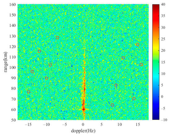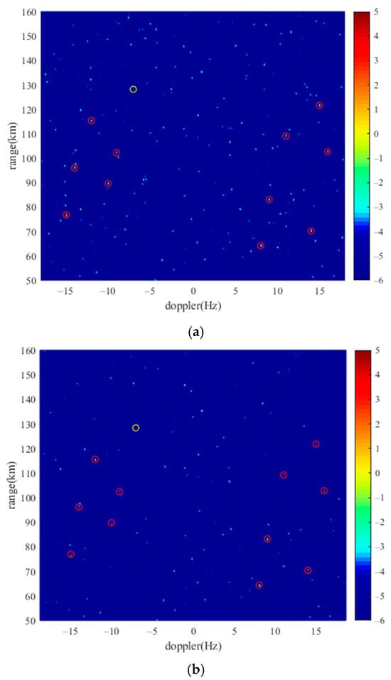 In order to effectively identify the target, it is essential to suppress clutter present in the original dataset. The time-domain cancellation algorithm is employed for this purpose, as shown in Figure 8. Following the application of clutter suppression, a substantial reduction in clutter is achieved, leading to a decrease in floor energy, thereby allowing for the clear display and identification of the simulation target. The simulation targets highlighted within the red circle in the figure represent high SNR targets with a minimum SNR of 11.2 dB post-suppression. This high SNR is attributable to the high energy levels associated with these targets, rendering them highly distinguishable on the RD map. Conversely, the simulation target located at (128 km, −7.044 Hz), which is encircled in yellow has a low SNR of merely 7.8 dB after clutter suppression, a consequence of its lower energy configuration, resulting in its diminished prominence on the RD map.