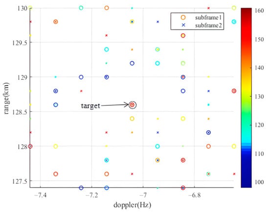 The application of this method for estimating the DOA of the peak points within each sub-frame facilitates the acquisition of their corresponding azimuth information, thereby enabling the generation of the peak azimuth spectrum. The comparison of the peak azimuth spectrum from two adjacent sub-frames is shown in Figure 11. In this figure, the dot represents the peak azimuth spectrum of sub-frame 1, while the cross represents the peak angle spectrum of sub-frame 2. The target under consideration is a weak simulation target, with color coding employed to indicate the values of the azimuth angles. The weak target is successfully detected in both adjacent sub-frames through the application of sliding matching filtering, with detections occurring in the direction of the main lobe. Notably, the azimuth spectrum of the two sub-frames exhibit distinctly different peaks at varying ranges, Doppler shifts and azimuth angles, suggesting that these peaks are spatially unstable in comparison to the target. Consequently, the spatial stationary characteristics allow for the differentiation of the target from false alarms.