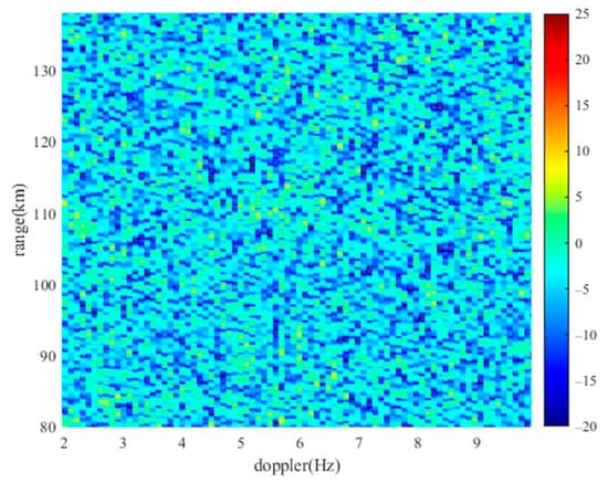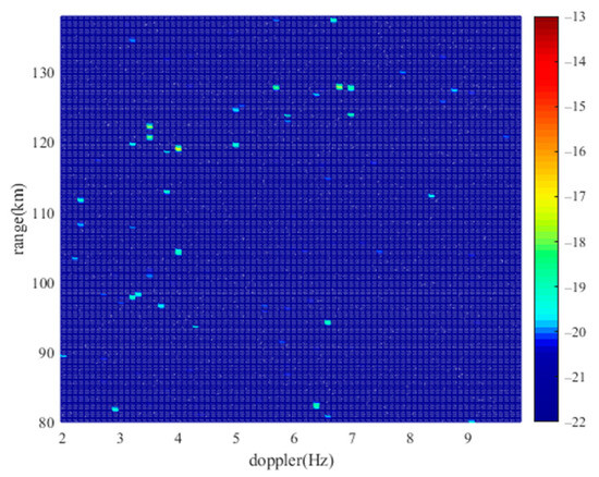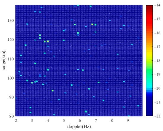 Figure 9 is a Doppler slice of the low SNR simulation target (128 km, −7.044 Hz). This target exhibits a peak that exceeds the floor energy at the corresponding position. Consequently, this target will remain detectable when extracting all peaks that surpass the floor energy on the RD map, thereby facilitating the generation of the peak information matrix.