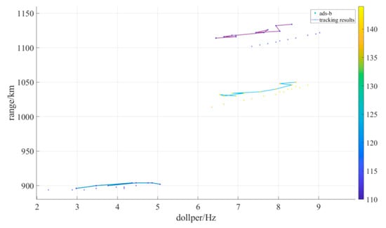 The tracking results are shown in Figure 14. The track generation method based on spatial–temporal stationarity effectively tracked two simulated trajectories. This indicates that when a target can establish a stable trajectory, the points along that trajectory can be consistently tracked and preserved throughout the tracking process. Therefore, by using the spatial–temporal stationarity of the target to generate the trajectory, it is possible to further eliminate scattered false alarm points while simultaneously maintaining the target track.