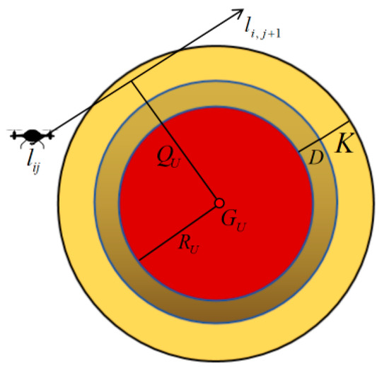 When the UAV flies autonomously, the safe operation of the UAV must be ensured. Considering the complexity of threat modeling and the difficulty of obtaining real data, this study abstracts the threat environment, and the threat area is modeled as a cylinder, because the cylinder has the characteristics of being simple and intuitive, making it easy to compute and giving it strong applicability. The purpose of setting the threat region is to ensure the safety of UAVs in urban environments. As shown in Figure 2, is the set of all existent threats, the center of the circle of the threat projection is , the radius of the threat object is , the perpendicular distance between the two neighboring path nodes, and the center of the circle is ; taking into account the range of the UAV itself, let the diameter of the UAV be , denotes the danger area of the obstacle, the value varies with the specific signal situation of the UAV, and the distance of within the area of is inversely proportional to the threat cost, the second heaviest cost, and the threat cost function can be expressed as: