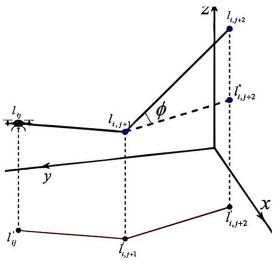 The concept of the ‘angle of climb’ is crucial in the field of aviation, as it refers to the angle that an aircraft, drone, or other vehicle makes between its flight path and the horizontal plane during ascent. The ‘smoothing cost’ is used to evaluate the cost of smoothing the trajectory of a vehicle during flight. A large climb angle may mean that the vehicle can rapidly rise to the target altitude in a short period of time, but this often requires a larger power output, which may lead to a large amount of energy consumption, and may also increase the smoothing cost by increasing the mechanical wear and handling difficulty due to the drastic change in flight attitude. The climb angle in this study is shown in Figure 3, and the climb angle consists of paths and , which are represented by the climb paths with their projections on the plane: