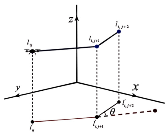The angle of turn is the same as the angle of climb, both of which directly affect the smoothing cost of UAV flight when varied, and in this study, the angle of turn, θ, is shown in Figure 4, and is represented by the projection of the UAV’s flight trajectory in space onto the surface: