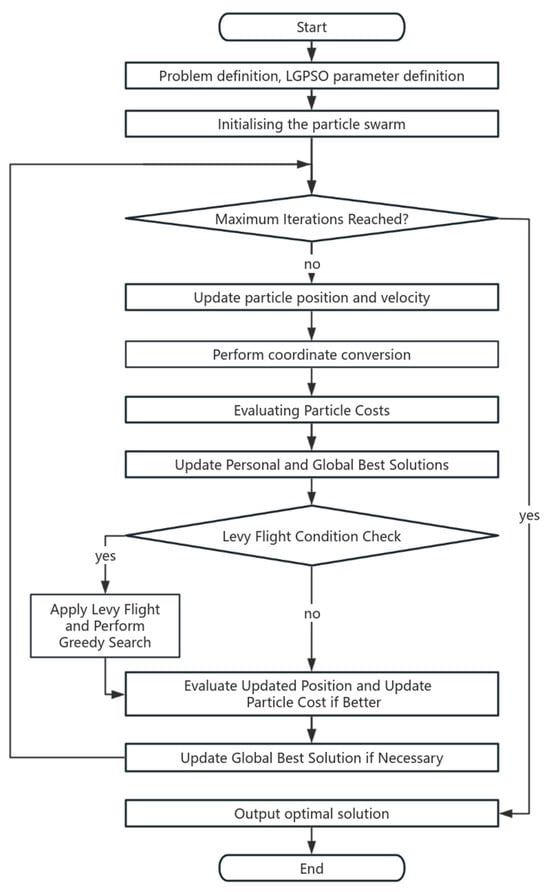 In this paper, the improved particle swarm optimization algorithm (LGPSO) is applied to the optimal path planning problem for logistics UAVs. The flowchart and pseudo-code for LGPSO are illustrated in Figure 5 and Algorithm 1. The operational procedure of the improved Lévy flight particle swarm optimization (LGPSO) is outlined as follows: Initially, the particle swarm is initialized, and in each iteration, the particles’ positions and velocities are updated. Subsequently, the particle costs are evaluated, and the optimal solution is updated accordingly. After the particles undergo an update through the improved Lévy flight mechanism, a greedy search evaluation is conducted to determine whether the updated positions should be accepted. The optimal solution is then output once the maximum number of iterations is reached. The integration of Lévy flight and greedy search enhances the algorithm’s search capabilities and convergence speed, thereby enabling more efficient pathfinding.