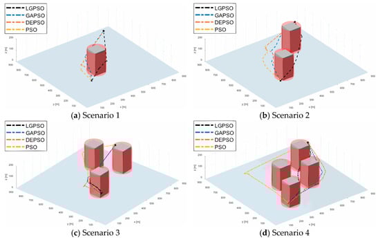 Figure 9 clearly shows the 3D views of the paths obtained by LGPSO in the four simulation scenarios. It can be clearly seen that the paths plotted by the LGPSO algorithm are extremely smooth while maintaining an appropriate flight altitude with respect to the buildings. Moreover, the climb and turn processes appear to be very gentle. Such a characteristic is of great significance, which can effectively avoid unnecessary power consumption when the UAV performs drastic climbs and turns. In this way, the LGPSO algorithm not only ensures the safety and stability of the UAV flight, but also improves the endurance of the UAV to a certain extent, which provides a strong guarantee for the efficient operation of the UAV in practical applications.