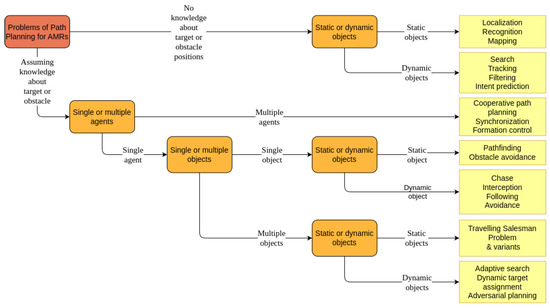 Several surveys on similar topics are available in the literature [28,35,36,37,38,39,40,41,42,43,44]. In the surveys, the covered topics range from multi-agent path planning [28,35,40,41,42], coverage path planning [38,39], moving target search [28,35], and general path planning [36,37,40,41,43]. However, none of them focus primarily on multiple moving objects of interest. An overview of the taxonomy of problems directly related to path planning for AMRs is given in Figure 1.