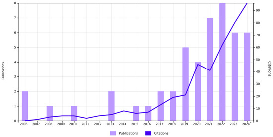 Number of publications and citations of papers found through the Web of Science search through the years (* 2024 publication data is incomplete, publications until 4 October 2024).