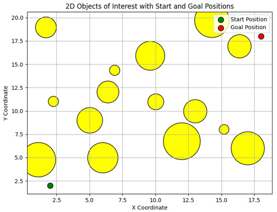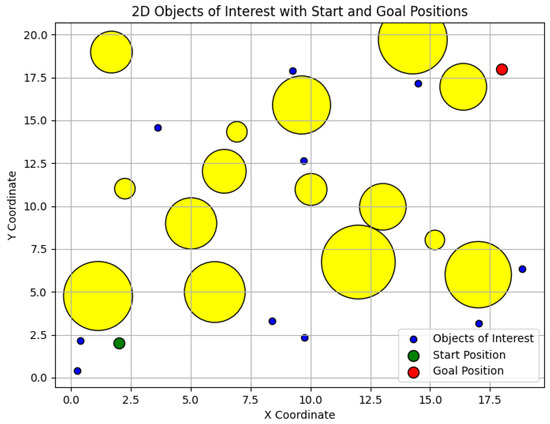 Illustration of a 2D path planning environment with multiple static objects (red and blue points) of interest and multiple static obstacles (yellow circles).