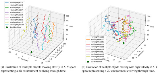 The dynamic nature of the environment has a multifaceted meaning. It can signify moving obstacles to be avoided, moving objects of interest to be intercepted, and changing attributes, such as wind or waves. This article focuses on the former two, as presented in Figure 5 for a single moving object and in Figure 6 for multiple moving objects. In Figure 6, Figure 6a presents slow objects with regards to the robot And Figure 6b the fully dynamic environment.