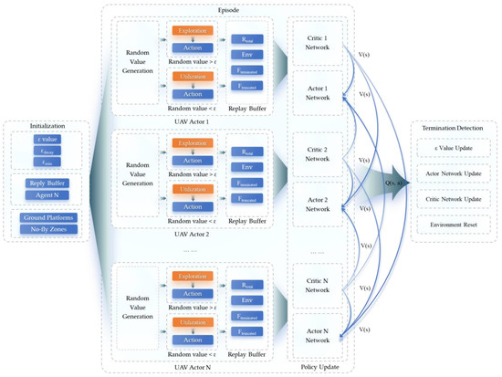 In the initialization phase, the agent employing the MAPPO algorithm is first initialized, which is able to share strategies and states with other agents in the training environment, thereby achieving collaboration among multiple agents as well as UAVs. In order to balance exploration and exploitation, Mix-Greedy MAPPO sets the exploration probability parameter ε and introduces εdecay to gradually reduce the exploration probability, thus reducing the exploration behavior and facilitating the algorithm to converge to the desired state. In addition, the algorithm introduces a minimum exploration probability εmin to ensure that the exploration probability does not fall below this value, thus avoiding the failure of the exploration strategy.