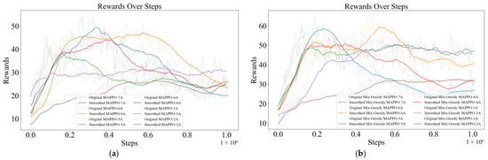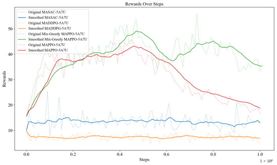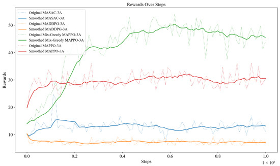 Figure 3) shows the rewards of each algorithm obtained during the training progress, where the average reward of each algorithm of Mix-Greedy MAPPO (ε = 0.97), Mix-Greedy MAPPO (ε = 0.9), MAPPO, MASAC, and MADDPG are 43.42, 38.93, 29.76, 13.16, and 7.28, respectively. To improve the readability of the figure, the colored lines in the figure below (