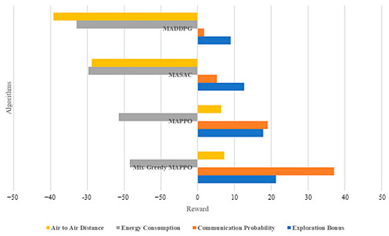 Figure 6) shows the highest reward results of various algorithms trained in environments with different numbers of UAVs. It can be seen from the figure that as the number of drones gradually decreases, the training reward of the Mix-Greedy MAPPO algorithm decays the least, and the reward of the Mix-Greedy MAPPO algorithm is higher than that of other algorithms in environments with different numbers of drones.