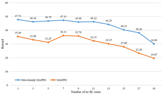 Figure 5) shows the performance changes of the major algorithms while the number of no-fly zones increases. The blue line indicates the rewards of Mix-Greedy MAPPO while the orange line indicates the rewards obtained by MAPPO.