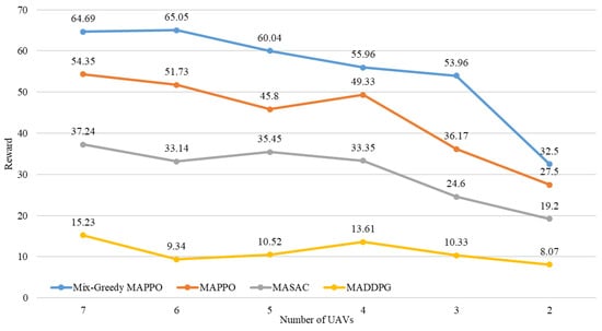 The higher the number of UAVs, the higher the score that each algorithm can achieve, but the improvement of the reward decreases, implying that simply increasing the number of UAVs is not the optimal solution for communication relaying, and optimization in cooperative path planning and communication power control is necessary. Therefore, Mix-Greedy MAPPO has a high potential for practical application due to its higher rewards than other algorithms for each number of UAVs.