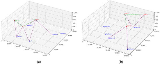 Figure 9) shows the results of visualizing the state of the UAV and the ground platform, where the UAV movement is determined by the deep reinforcement learning algorithm. In the figure, the communication link between the UAV and the ground platform is represented by the purple dotted line, the communication link between the UAV and the UAVs is represented by the green dotted line, and the movements of the UAV and the ground platform are mapped into the three-dimensional space; a connecting line will be generated between the UAVs and the ground platform or the other UAVs when they establish a communication connection. For example,