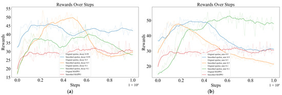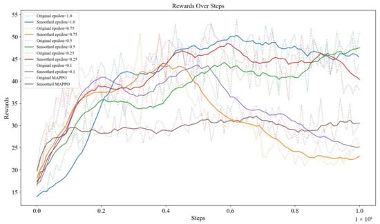 Figure 10). The results show that when the ε value is small (purple curve), the algorithm is prone to achieve higher reward values faster at the initial stage, but it is not favorable for the algorithm to explore the global optimal strategy. On the contrary, with larger ε values (blue curve), the algorithm achieves a higher reward score in the end than the algorithms that choose other ε values, even though the initial reward score is lower. Due to the exploration, curves of Mix-Greedy MAPPO are generally higher than that of MAPPO (brown curve).