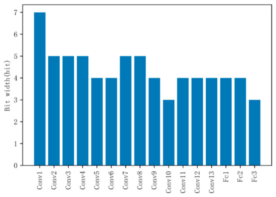 As can be seen from Figure 10, a relatively high quantization bitwidth is adaptively chosen for the first layer of the model to retain richer low-dimensional information, while for the deeper layers of the network, a lower data bitwidth is required. For the shallow layer (the part close to the input) in the neural network, we tend to use a higher quantization bit width. This is because the shallow layer is responsible for extracting the underlying features from the raw data, which often contain a great deal of detail and information. Using a higher quantization accuracy can help to better preserve this low-dimensional information, thus ensuring that subsequent layers can base their calculations on more accurate data. In contrast, lower quantization bitwidths are acceptable in the deeper layers (the parts closer to the output). The deeper layers are mainly responsible for combining the high-level abstract features extracted from the previous layers to accomplish the final task, such as classification or regression. At this point, there is no need for the specific details of the raw data anymore, so even a small reduction in the precision of the numerical representation will not affect the overall result too much.